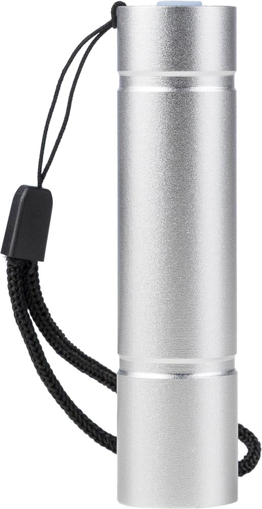 COB-Taschenlampe aus recyceltem Aluminium mit 80–100 Lumen und drei Leuchtmodi (Front, Seite, Blitz). Sie verfügt über einen Druckknopf, eine Polyester-Handgelenkkordel und ein eingraviertes Recycling-Logo. Sie ist wiederaufladbar über USB-C (300 mAh Akku) und wird inklusive eines 30 cm langen schwarzen Ladekabels geliefert. Die Lampe ist in einem braunen Karton mit Abbildung verpackt.
