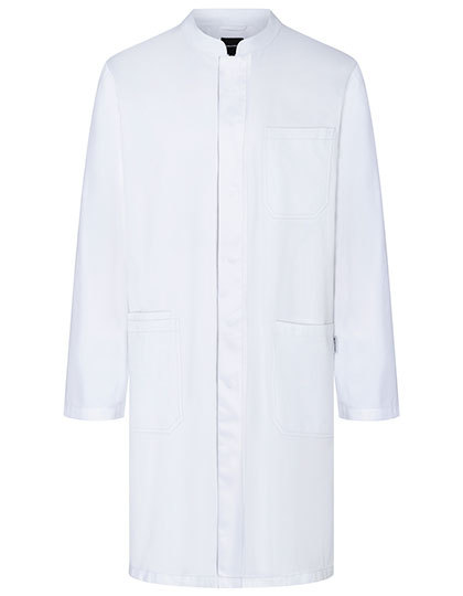 Köpergewebe | Hochveredelt, einlaufvorbehandelt, waschecht, pflegeleicht | Langer Arbeitskittel mit modernem Stehkragen | Leicht tailliert geschnitten | 2 aufgesetzte Seitentaschen mit verdeckter Innentasche rechts | 1 Schlaufe in der Seitentasche zur Anbringung einer Schlüsselkette | 1 aufgesetzte Brusttasche links (mind. 10 x 11,5 cm) | Versteckte Knopfleiste mit 6 Druckknöpfen | Seitenschlitze für besondere Bewegungsfreiheit | Lange Ärmel mit größenverstellbarer Einknopfmanschette | Industriewäschetauglich