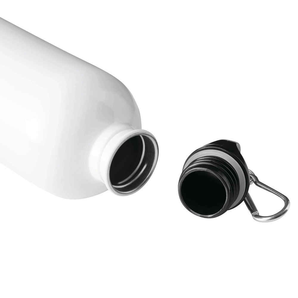 Trinkflasche SMALLTRANSIT, einwandig: aus recyceltem Edelstahl, schwarzer Kunststoff-Deckel mit sicherem Schraubverschluss, Silikon-Dichtring, Tragegriff, Schlüsselring und Karabinerhaken (der Karabiner ist NICHT als Sicherung beim Klettern geeignet), Füllmenge ca. 550 ml