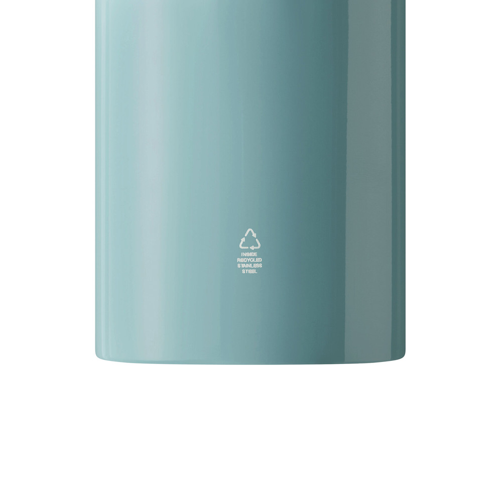 Trinkflasche SMALLTRANSIT, einwandig: aus recyceltem Edelstahl, schwarzer Kunststoff-Deckel mit sicherem Schraubverschluss, Silikon-Dichtring, Tragegriff, Schlüsselring und Karabinerhaken (der Karabiner ist NICHT als Sicherung beim Klettern geeignet), Füllmenge ca. 550 ml
