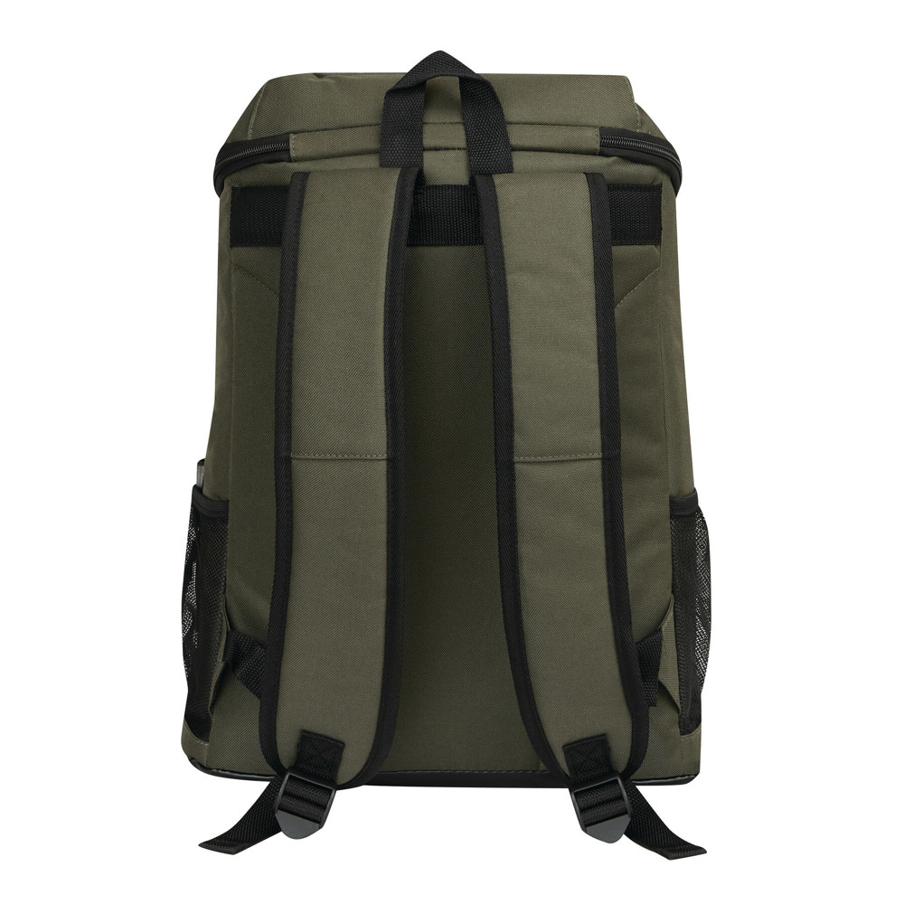 Kühlrucksack YUKON: 1 großes isoliertes Reißverschluss-Hauptfach mit PEVA-Futter, 1 Reißverschluss-Vorfach mit Reißverschluss-Netzfach, 1 vertikales Reißverschluss-Vorfach mit reflektierendem Streifen, 2 seitliche Netzfächer, 1 abnehmbarer Flaschenöffner aus Edelstahl, wasserabweisender Boden, verstellbare gepolsterte Schultergurte, Tragegriff