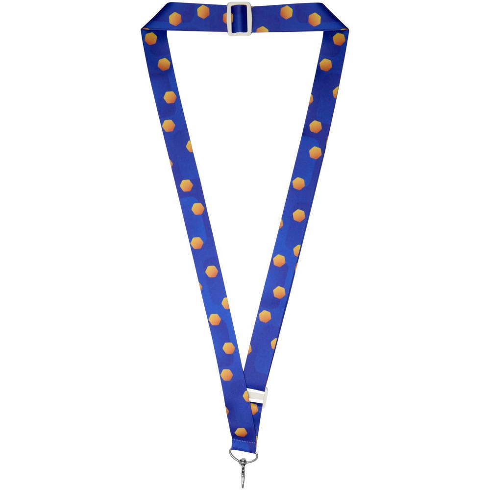 Verstellbares Lanyard mit Schiebeschnalle zum einfachen Verstellen der Länge und einem stabilen Metallhaken zum sicheren Befestigen von Namensschild, Ausweis oder Schlüsseln. Es kann ein- oder beidseitig bedruckt werden, wahlweise mit Standard- oder angepasster beidseitiger Bedruckung (eine angepasste Bedruckung gewährleistet, dass das Design auf beiden Seiten übereinstimmt). Hergestellt in Europa.