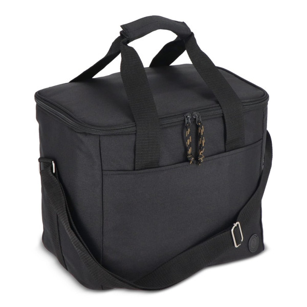 Geräumige, stilvolle und sportliche Kühltasche aus grünem rPET-Material. Schöne Details in Beige und Schwarz. Praktisch mit einem Griff und einem verstellbaren Schultergurt.