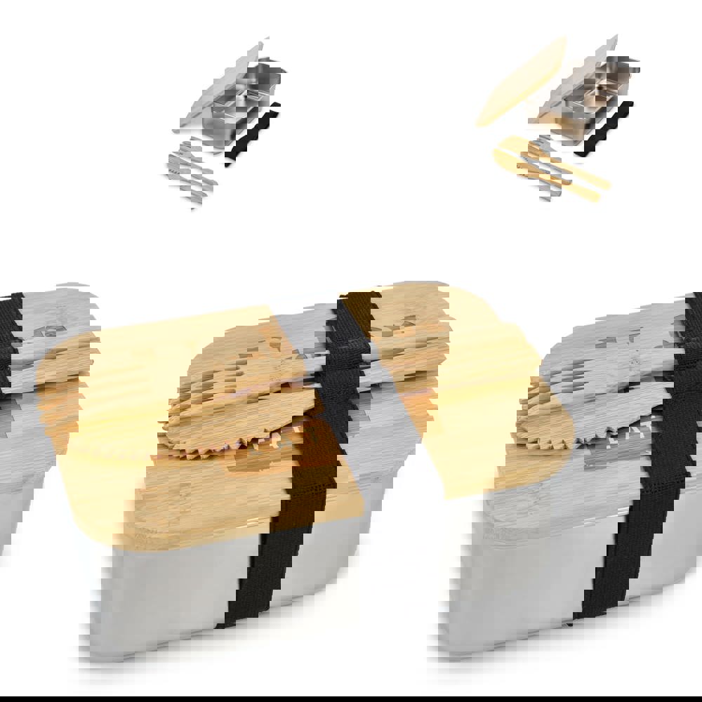 Edelstahl-Brotdose mit Bambusdeckel. Verschluss mit einem elastischen Band, an dem auch die Bambusgabel und das Bambusmesser aufbewahrt werden. Einzeln verpackt in einer Geschenkbox.