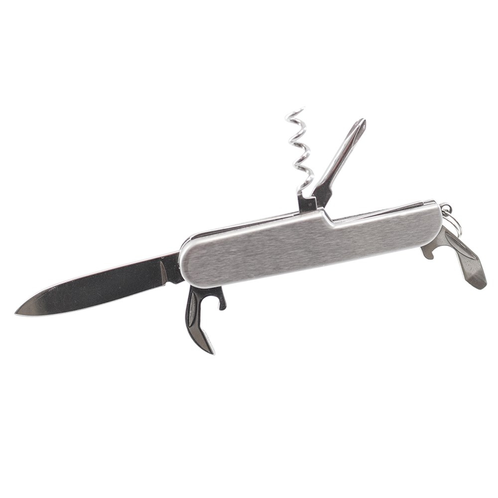 Vielseitig verwendbares Taschenmesser mit 6 Funktionen. Enthält Messer, verschiedene Öffner, Schraubendreher und Schlüsselring. Präsentiert in einer individuellen Box.