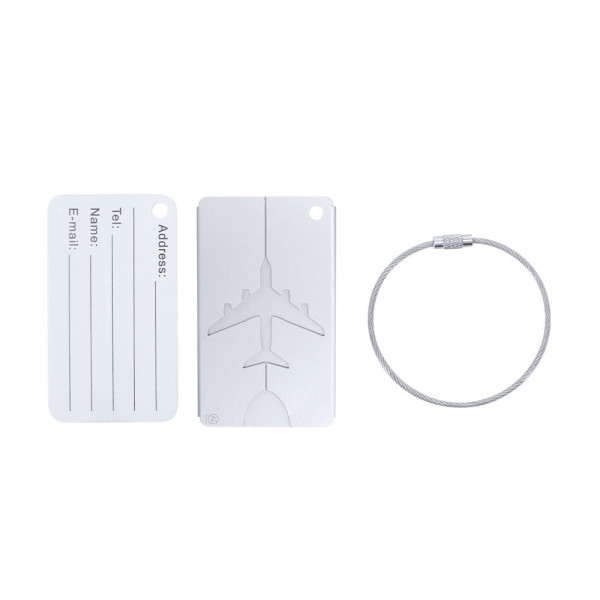 Ursprüngliche Kofferkennung mit Flugzeugdesign aus widerstandsfähigem recyceltem Aluminium. Mit Edelstahl-Kupplungsband mit Schraubverschlusssystem und Ausweiskarte auf Englisch mit folgenden gedruckten Feldern; Addres, Tel, Name, E-mail. AL: Recyceltes Logo, lasergraviert.