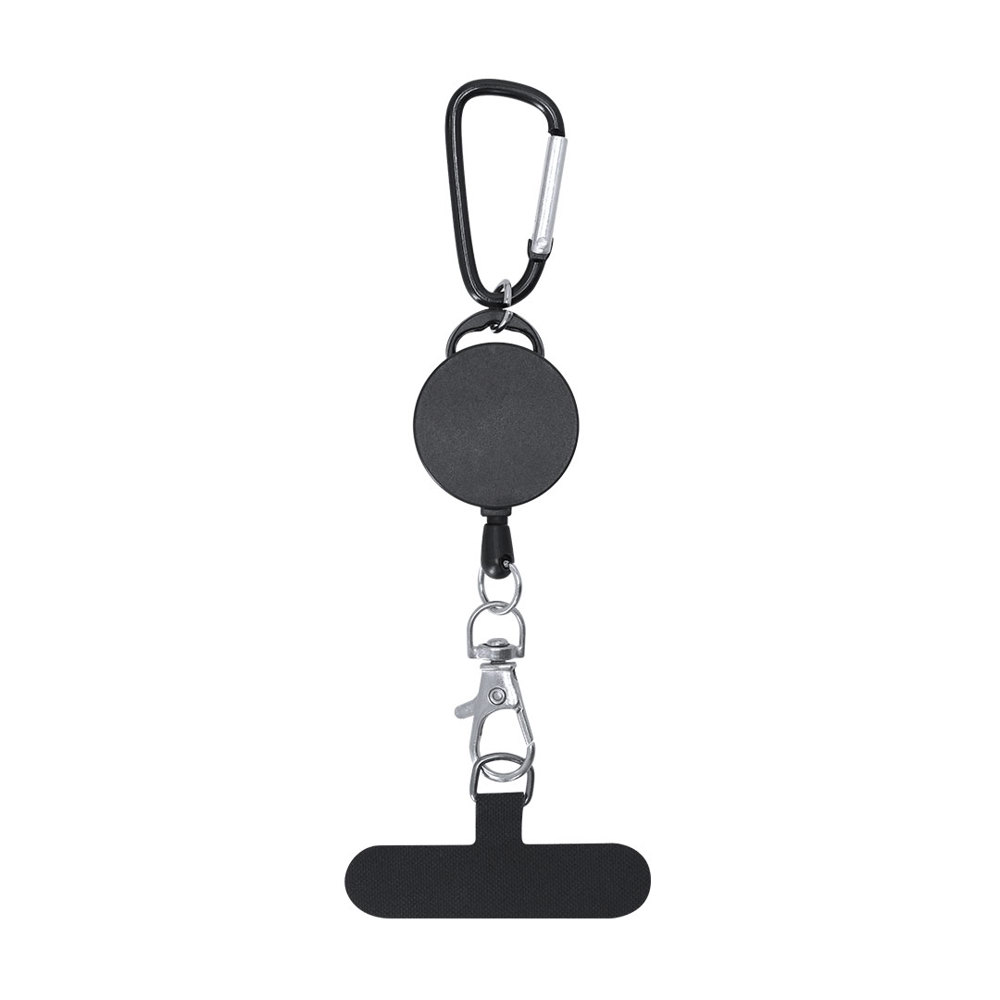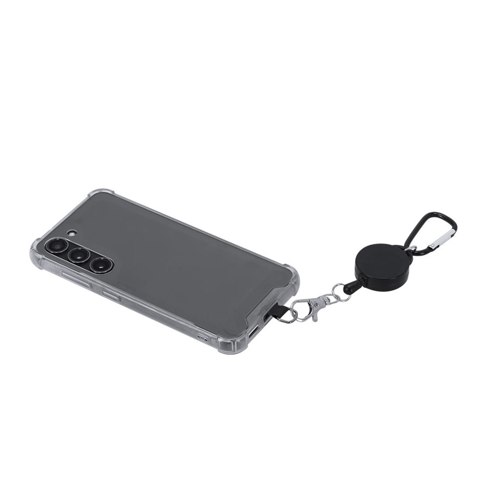 60 cm ausziehbarer Smartphone-Halter. Tragezubehör zum Platzieren zwischen Etui und Smartphone sowie Metallkarabiner. Am Ende ist ein Karabiner zum Aufhängen und zum einfachen Transport dabei.