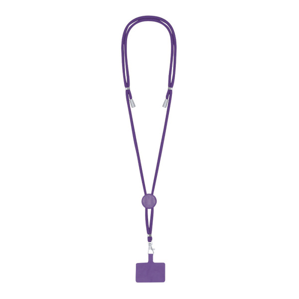Lanyard mit Smartphone-Zubehör. Aus langlebigem Polyester gefertigt. Tragezubehör zum Platzieren zwischen Etui und Smartphone sowie Metallkarabiner. Kragenversteller, mit Chromdetails an den Enden der Kordeln.
