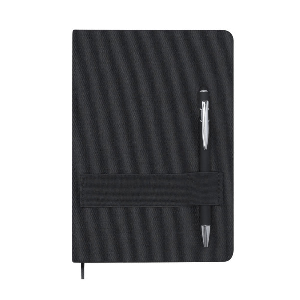 A5-Notizblock aus elegantem RPET. Starre Überzüge in Stoffoberfläche. Beinhaltet ein Gummiband am... mehr