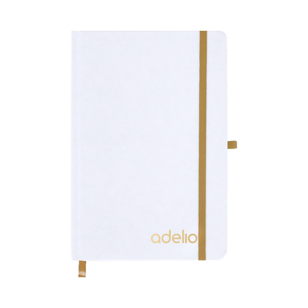 Notizblock mit steifen weißen Einbänden aus recyceltem Karton. Innenraum mit 80 verfügbaren Blättern für einen Streifen. Enthält ein Lesezeichen, in derselben Farbe wie elastisches Verschlussband und Stifthalter. Spezial für Lasergravuren, die die ausgewählte Farbe zeigt.