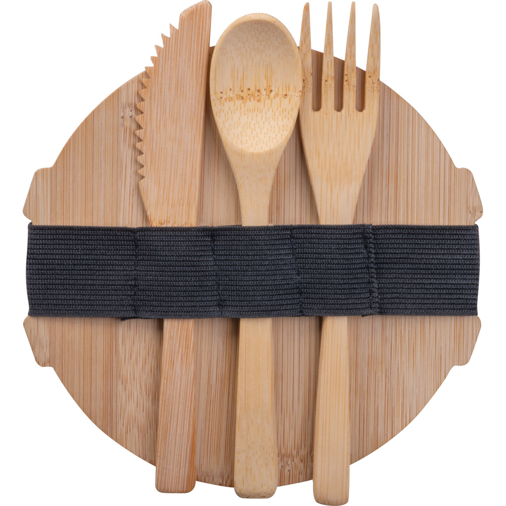 Lunchbox (Fassungsvolumen 700 ml) aus Metall mit Bambusdeckel sowie einem Löffel, einer Gabel und einem Messer, ebenfalls aus Bambus. Durch das Gummiband läßt sich der Deckel sowie das Besteck einfach an der Dose befestigen. Ihre Werbung bringen wir mittels einer Gravur auf dem Deckel an.