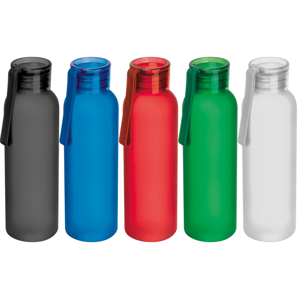 Trinkflasche aus PET mit einem Gummitragegriff am Deckel und einem Fassungsvolumen von 600 ml. Die gefrostete Oberfläche der Flasche sorgt für eine besonders schöne Haptik. Ihre Werbung drucken wir auf die Flasche.