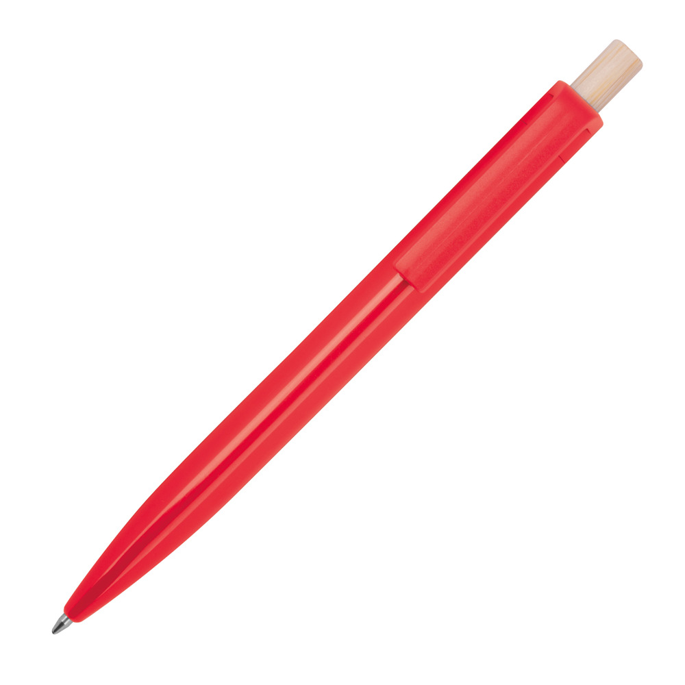 Kugelschreiber aus recyceltem ABS und einem Drücker aus Bambus. Er verfügt über eine blauschreibende Kunststoffmine. Ihre Werbung drucken wir unterhalb vom Clip aus den Schaft.
