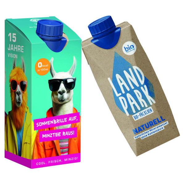 Werbeverpackung aus weißem Karton, individuell bedruckt. Inhalt: 1 recycelbares Tetra Pak® mit Landpark Mineralwasser, natriumarm ohne Kohlensäure in der Sorte Naturell, 0,5 l. Tetra Pak® mit wiederverschließbarem Deckel aus 40 % Zuckerrohr, pfandfrei. Weitere Sorten ab 8.000 Stück auf Anfrage, 500 g