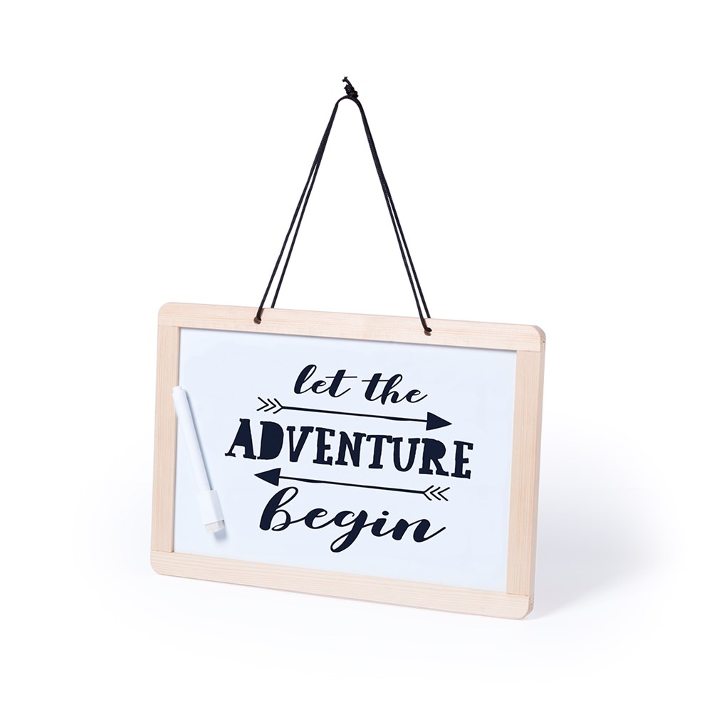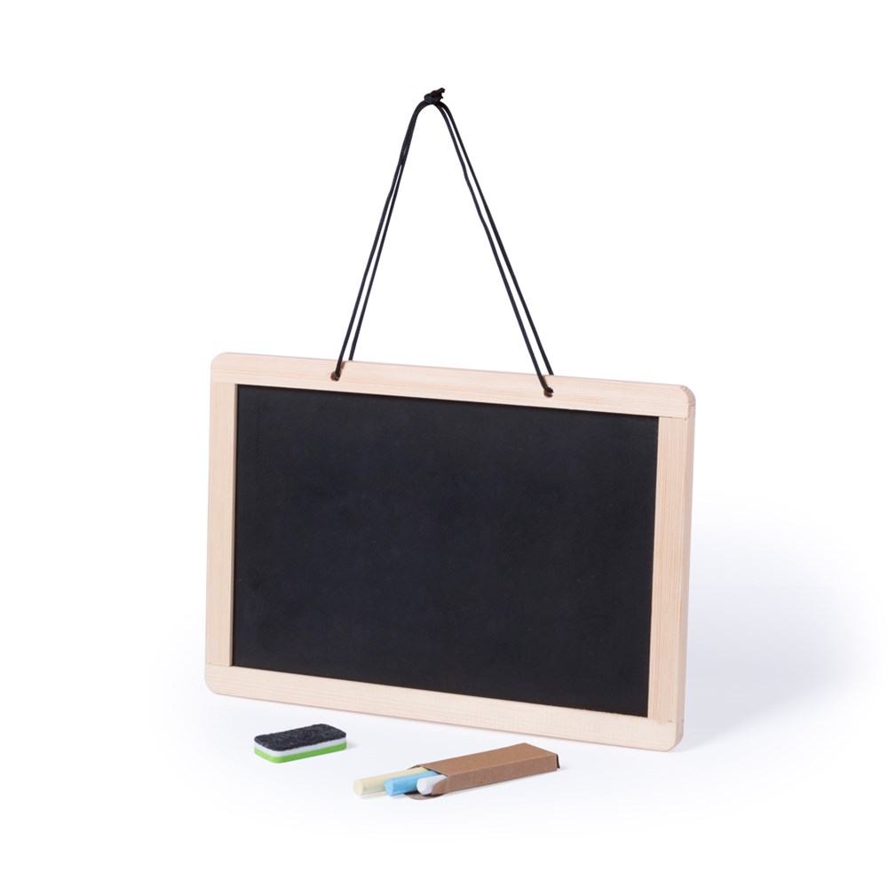 Beidseitig nutzbare Tafel zum Aufhängen, mit 2 verschiedenen Seiten: traditionelle Kreidetafel mit 3 Kreidestücken auf einer und Whiteboard mit Marker auf der anderen Seite. Mit doppelseitigem Radiergummi für Kreide und Marker.
