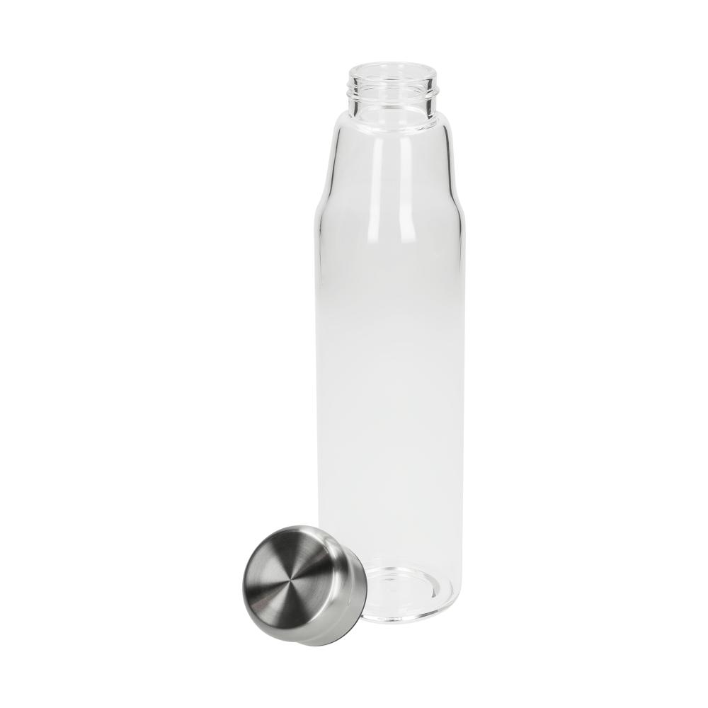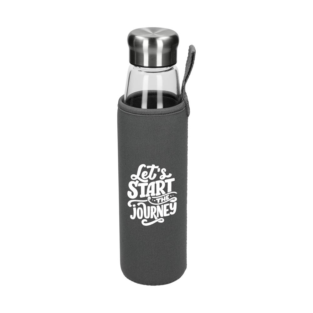 Schicke Borosilikat-Glasflasche mit Schraubverschluss aus Edelstahl inkl. Silikondichtung. Die griffige, graue Synthesekautschukhülle mit Halteschlaufe hält die Temperatur der Getränke länger konstant. Zudem schützt sie die Hände bei heißen Getränken vor dem warmen Glas. Füllmenge: 0,7 Liter.