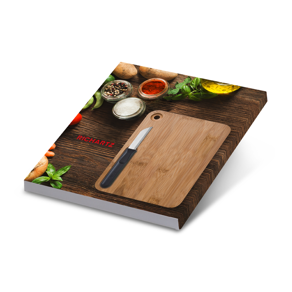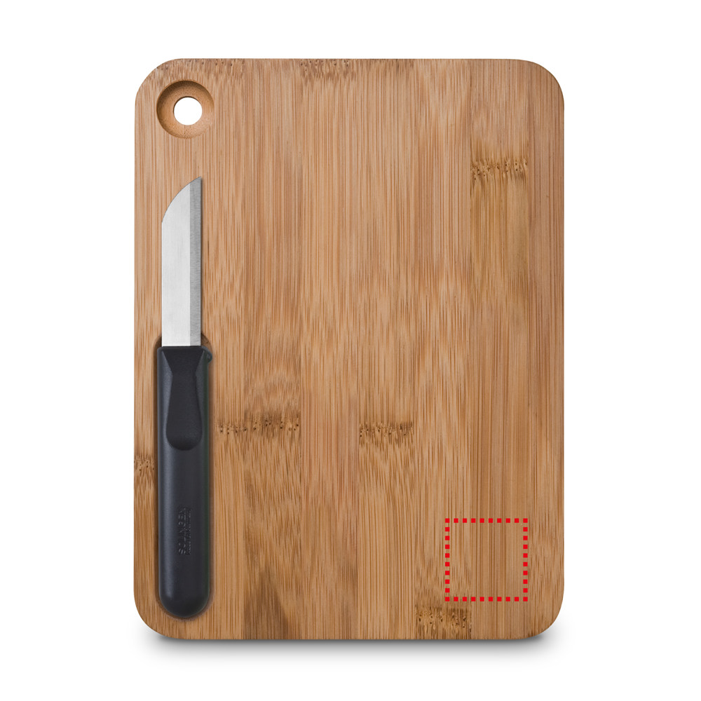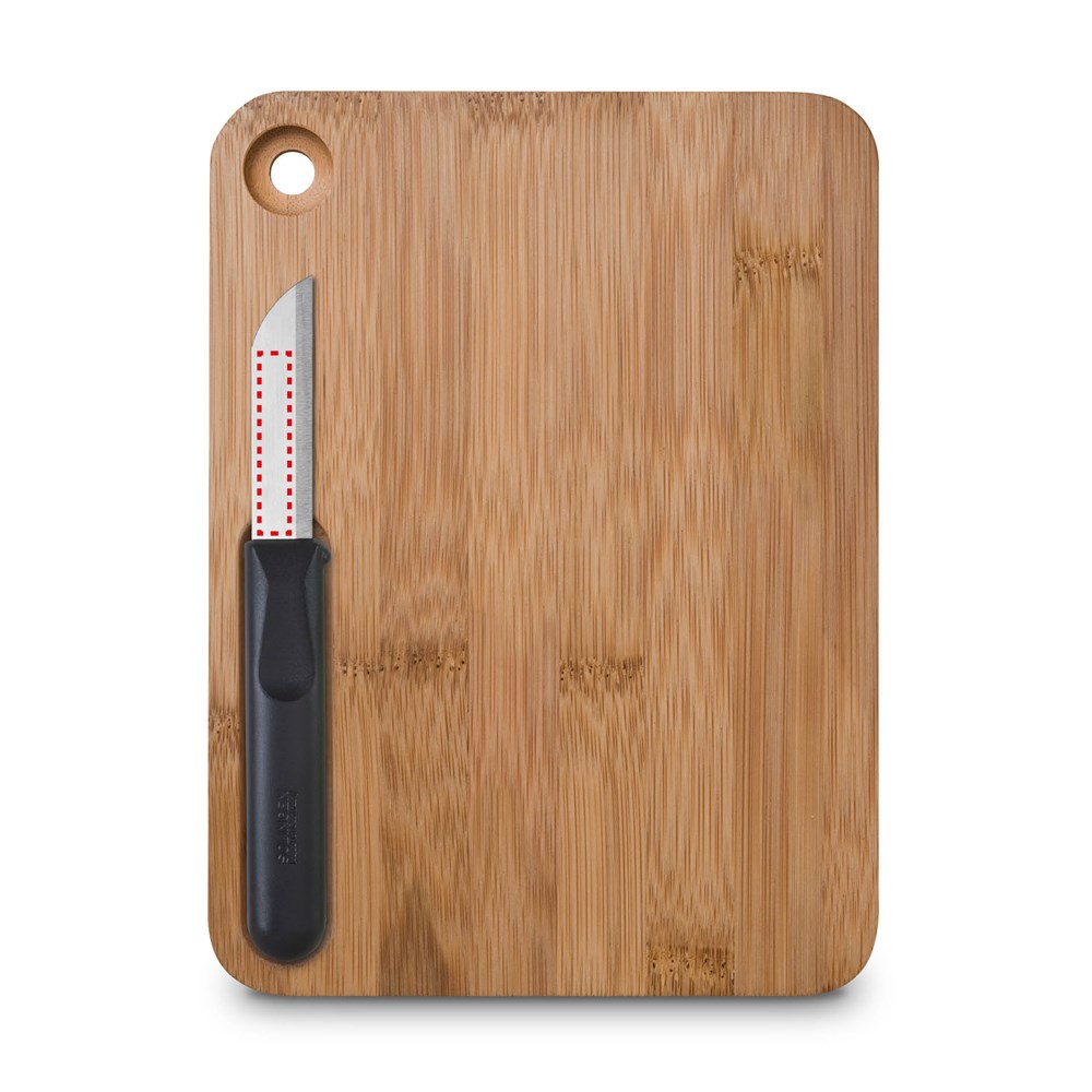 Das Messer wird magnetisch in der Griffmulde des Bambusbretts gehalten – ein echter Hingucker der durch die lange und häufige Nutzung dauerhaften Werbeerfolg garantiert.