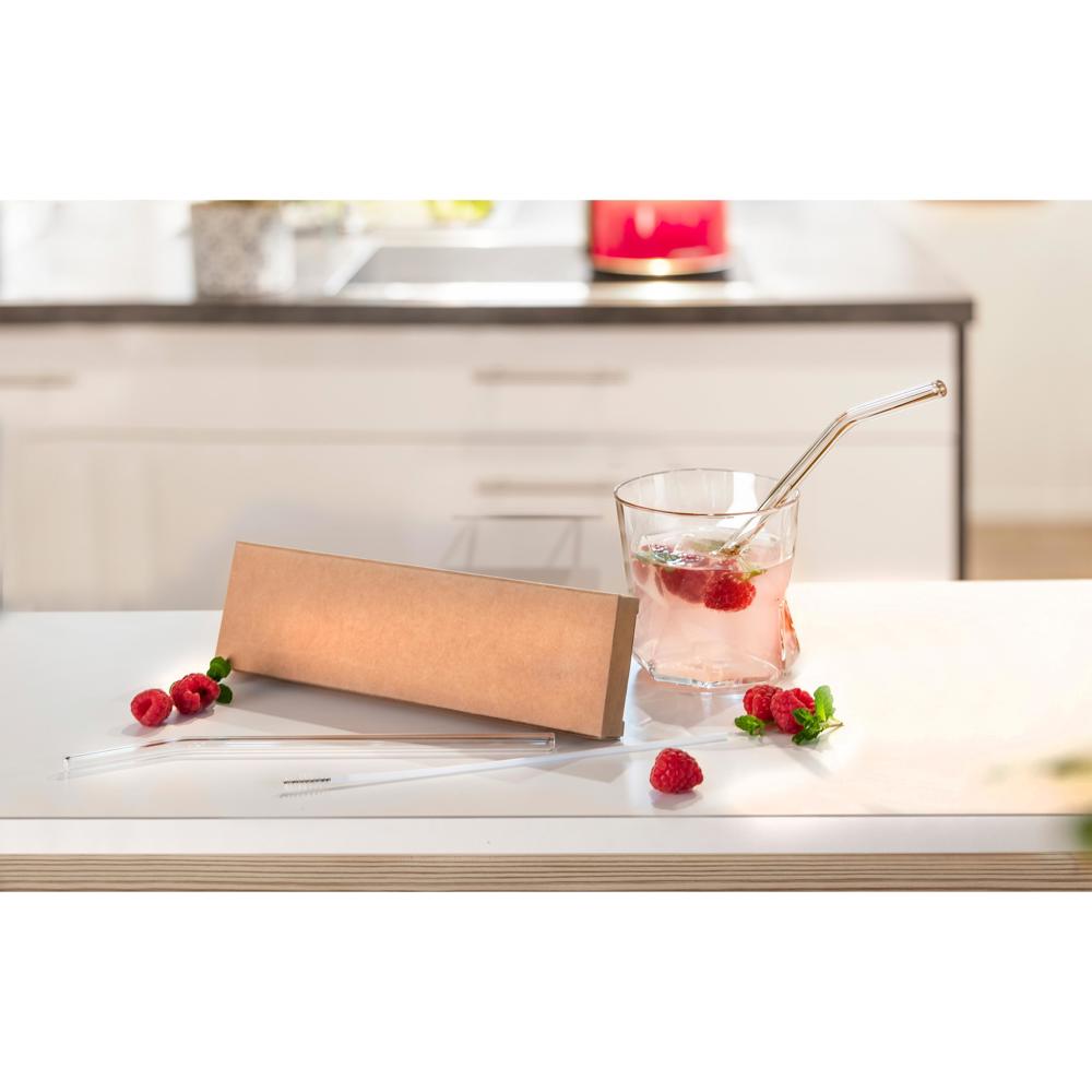 Schicke Alternative zu Plastik-Strohhalmen! Set bestehend aus zwei gebogenen Glas-Strohhalmen und einer Reinigungsbürste. Lebensmittelecht und geschmacksneutral. Länge: 21,5 cm.
