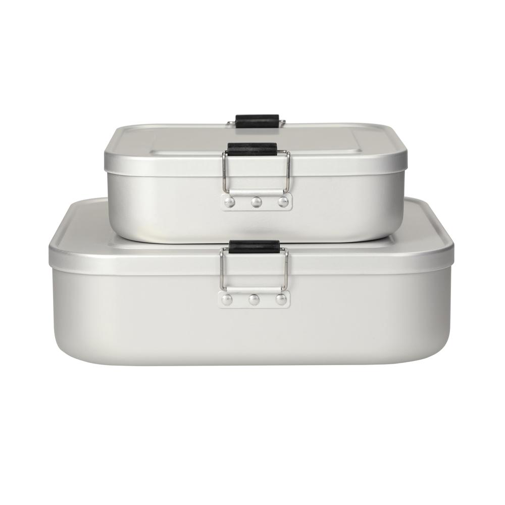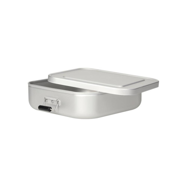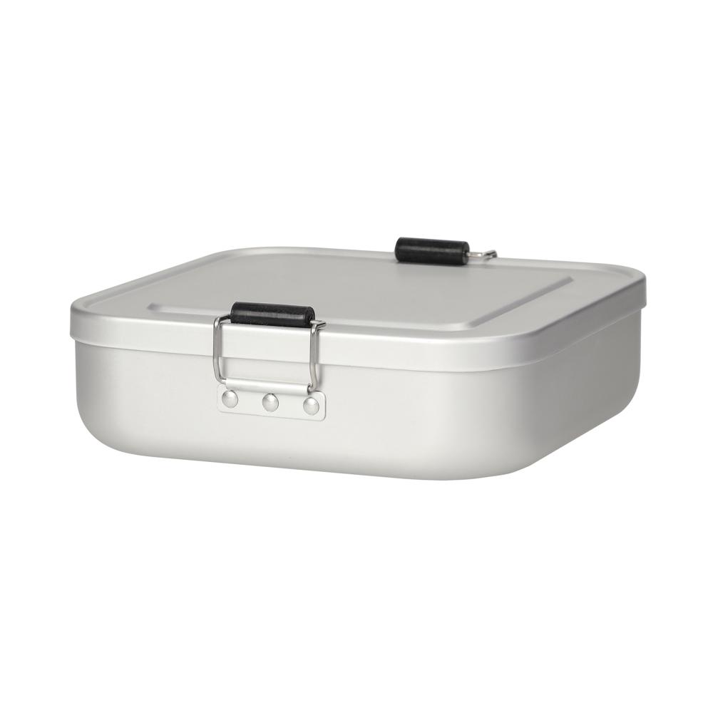 Kleine, quadartische Brotzeitbox aus Aluminium mit einer matten Oberfläche. Sicher verschließbar durch die beiden Klemmbügel. Der Deckel ist komplett abnehmbar. Nicht nur für den Einsatz auf der Baustelle geeignet.