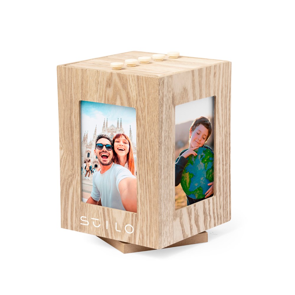 Einzigartiger würfelförmiger Fotorahmen aus Naturholz. Sein würfelförmiges Design ermöglicht die Präsentation Ihrer vier herausragendsten Fotos des Albums und verfügt darüber hinaus über eine um 360° drehbare Basis. Ideal für Fotos bis 13,5x9 cm. Präsentiert in einer individuellen Kraft-Designbox.
