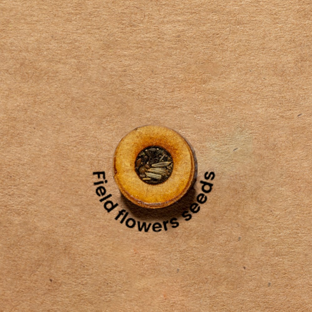 Samenmappe aus recyceltem Karton. Flexibler Einband mit spezieller Innenhalterung für Papierblätter und Gummibandverschluss. Die Hülle enthält eine Kapsel mit Wildsamen. Recycelter Karton entsteht durch die Wiederverwendung von Produktionsüberschüssen und Papierrecycling am Ende seiner Lebensdauer, was ihn zu einer ökologischen und nachhaltigen Leinwand macht.