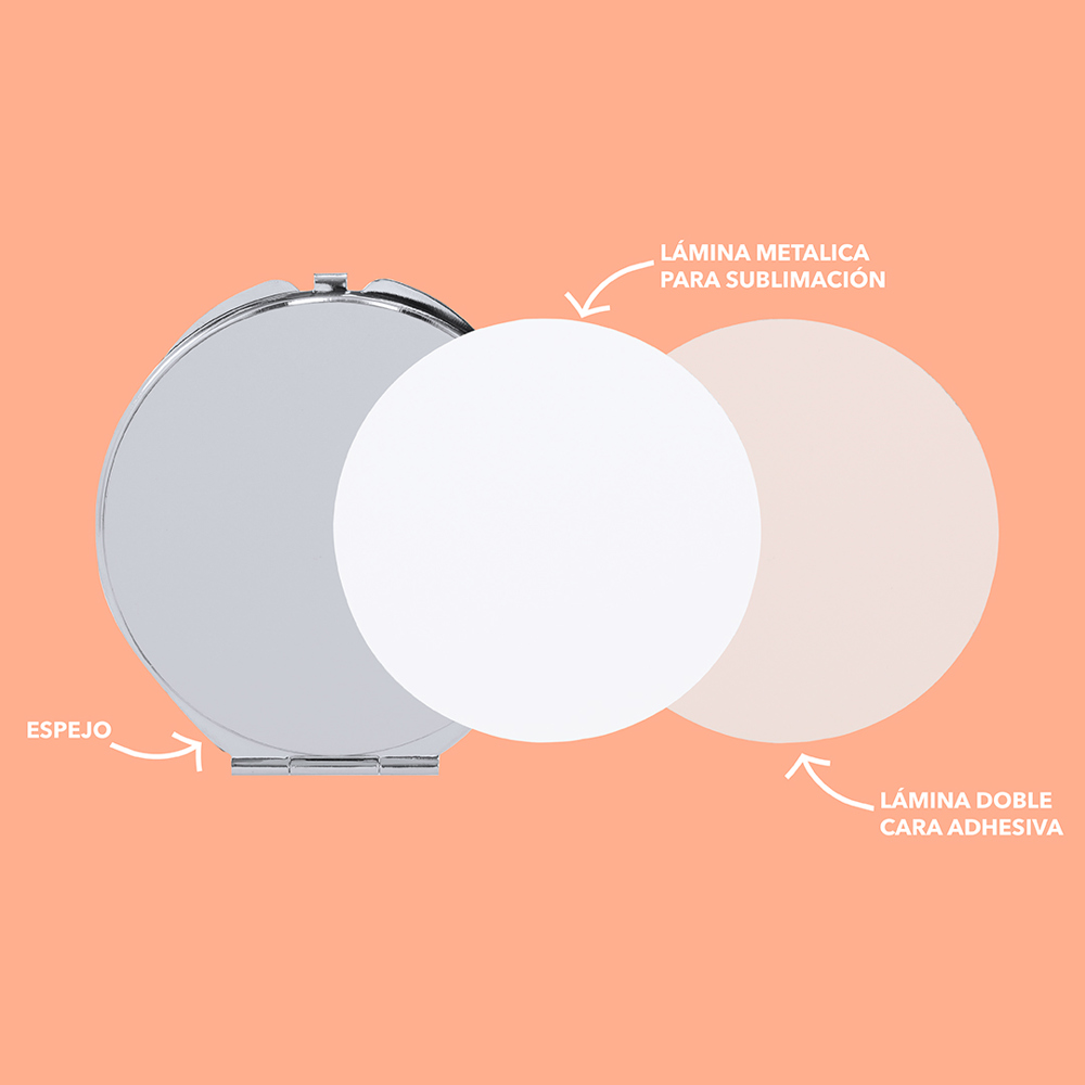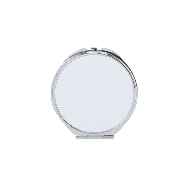 Faltbarer metallischer Spiegel mit Sublimationsfläche (nicht im Produkt integriert, ideal zum Drucken und späteren Aufkleben). Mit zwei Innenspiegeln: 1X und 2X-Vergrößerung.
