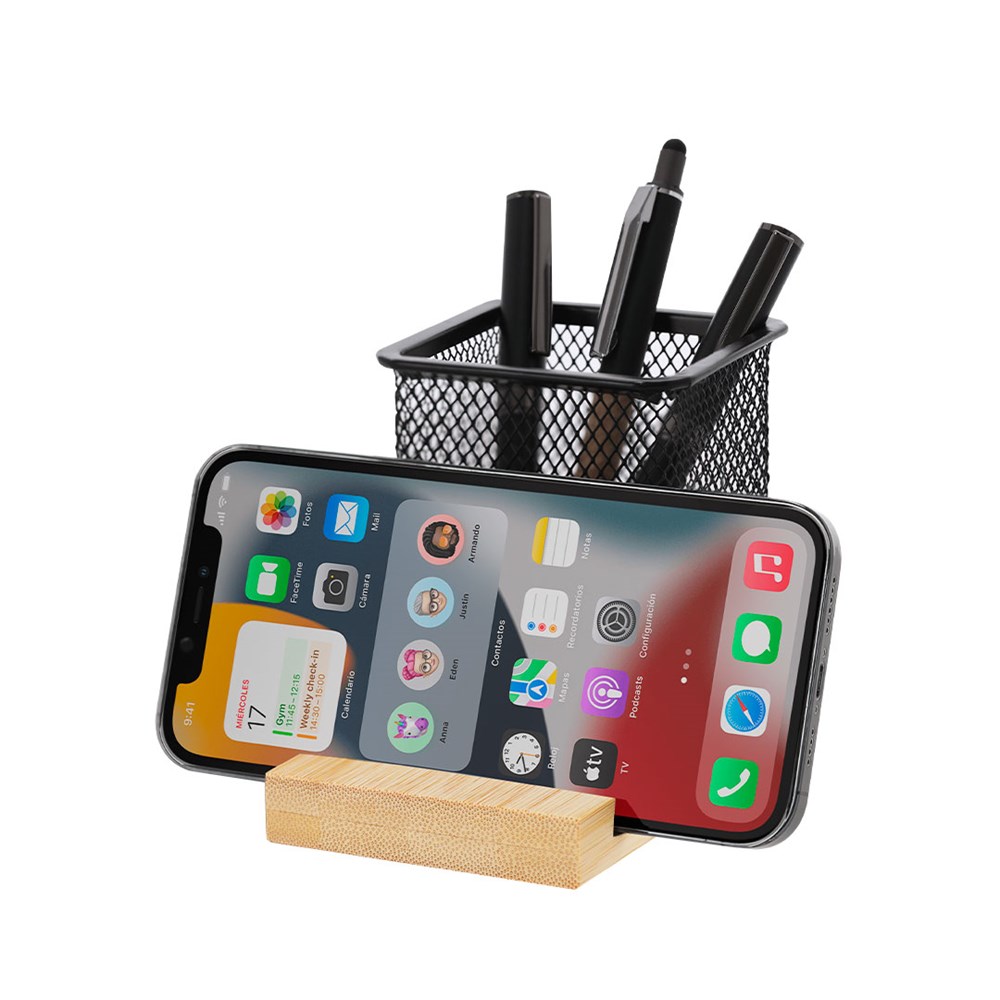 Stift aus Metallgitter mit natürlichem Bambusboden. Mit praktischem integriertem Halter für Smartphones entworfen.Materialien wie Bambus fördern die Verwendung natürlicher Rohstoffe und reduzieren die Schadstoffemissionen. Außerdem stammt der Bambus von einer sehr widerstandsfähigen und vielseitigen Pflanze, die schnell wächst und regeneriert, was ihn zu einer hervorragenden Alternative zur herkömmlichen Holzverwendung macht.