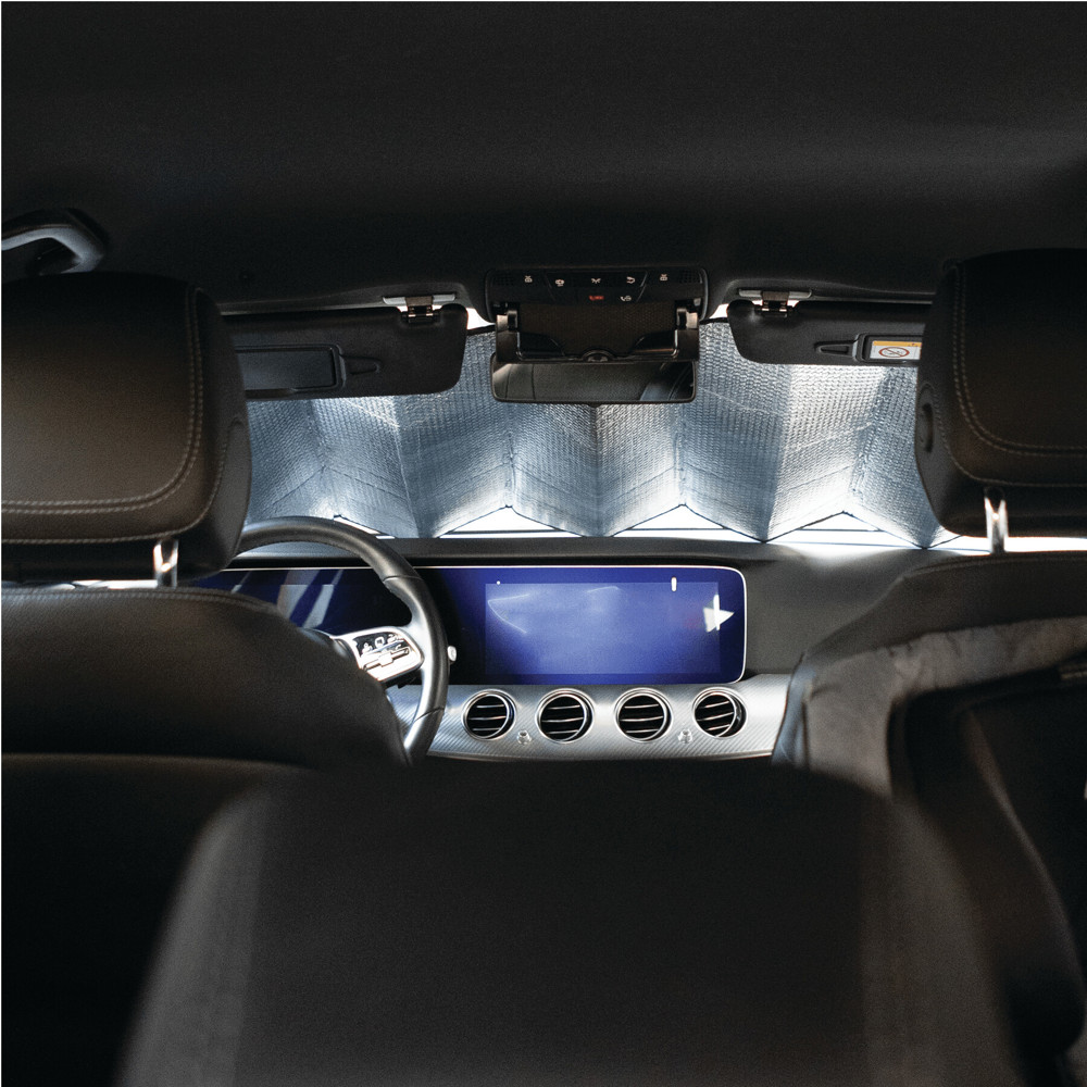 Auto-Sonnenschutz SHADOW FOLD: mit reflektierender Oberfläche, 2 seitliche Löcher zur Befestigung mit Saugnäpfen an der Frontscheibe, bei Nichtgebrauch durch Gummischlaufen platzsparend faltbar, inkl. 2 Saugnäpfen