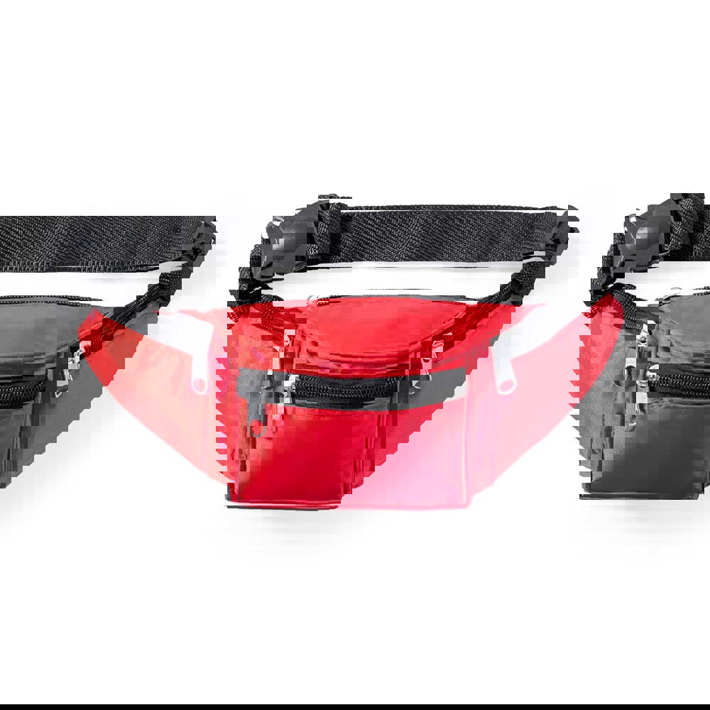 Bauchtasche aus robustem 420D Polyester in verschiedenen Farben. Mit 4 Reißverschlusstaschen und verstellbarem Hüftgurt mit Klickverschluss. Entwickelt für Sport- und Freizeitaktivitäten.