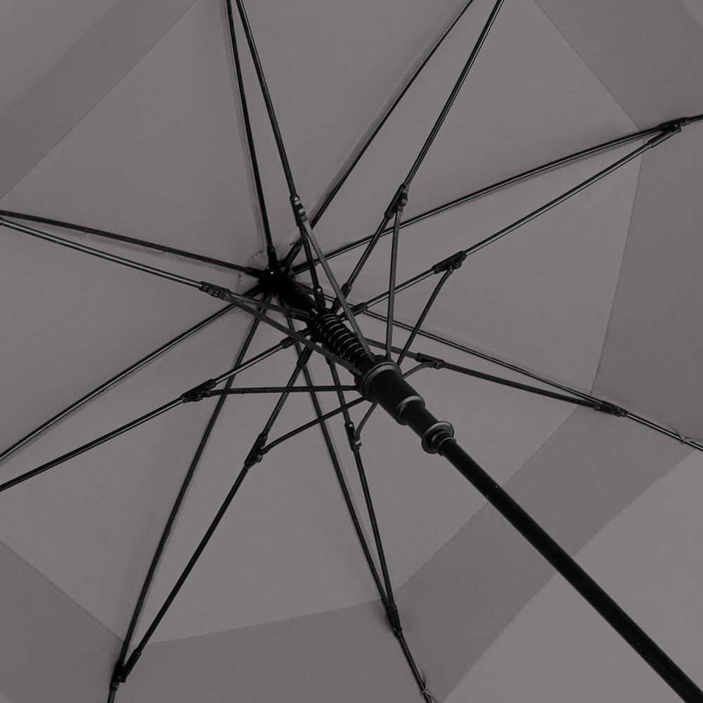 Exklusiver Automatik-Golf-/Gästeschirm für zwei Personen mit Golf-Design-Griff Komfortable Automatik-Funktion zum schnellen Öffnen, hochwertiges Windproof-PLUS-System für eine maximale Gestell-Flexibilität bei stärkeren Windböen, stabiler Fiberglasstock, flexible Fiberglasschienen, überlappender Ventilationsbezug zur Regulierung von Überdruck durch stärkere Windböen, Bezug mit zwei Schließbändern zur optimalen Fixierung im geschlossenen Zustand, exklusiver Soft-Touch-Griff in Golfball-Haptik mit silberner Auslösetaste und Werbeanbringungsmöglichkeit, komfortables Tragefutteral, gastfreundlicher großer Durchmesser