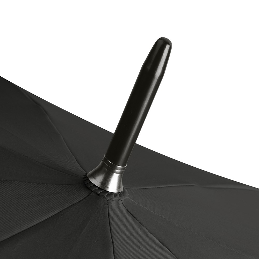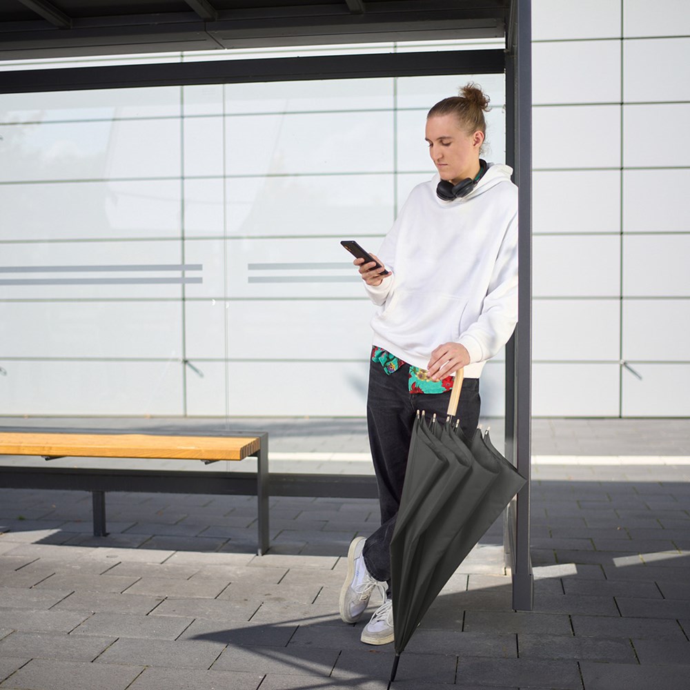 Preislich attraktiver nachhaltiger Gästeschirm mit Bezug aus recycelten Kunststoffen und Echtholzelementen Komfortable Automatik-Funktion zum schnellen Öffnen, Windproof-System für höhere Gestell-Flexibilität und bessere Windsicherheit, flexible Fiberglasschienen, wassersparend gefärbtes Polyester-Pongee waterSAVE® Bezugsmaterial aus recycelten Kunststoffen, mit waterSAVE® Label auf dem Schließband, Echtholzspitzen, Rundhakengriff aus Echtholz, höherer Korrosionsschutz durch schwarze Galvanisierung des Stahlstocks