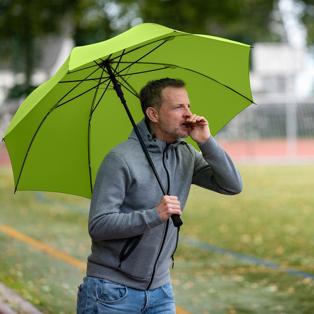 Komfortabler Automatik-Gästeschirm für zwei Personen mit handsympathischem Softgriff Komfortable Automatik-Funktion zum schnellen Öffnen, höhere Gestell-Flexibilität und bessere Windsicherheit durch Windproof-System, flexible Fiberglasschienen, gerader Softgriff, höherer Korrosionsschutz durch schwarze Galvanisierung des Stahlstocks, gastfreundlicher großer Durchmesser