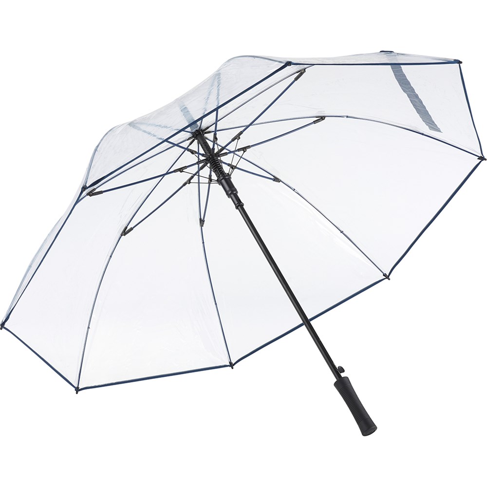 Ansprechender Automatik-Gästeschirm für zwei Personen mit transparentem Bezug und farbigen Details Komfortable Automatik-Funktion zum schnellen Öffnen, hochwertiges Windproof-PLUS-System für eine maximale Gestell-Flexibilität bei stärkeren Windböen, flexible Fiberglasschienen, farblich aufeinander abgestimmte Design-Elemente, matt-schwarzer gerader Kunststoffgriff mit Werbeanbringungsmöglichkeit, höherer Korrosionsschutz durch schwarze Galvanisierung des Stahlstocks