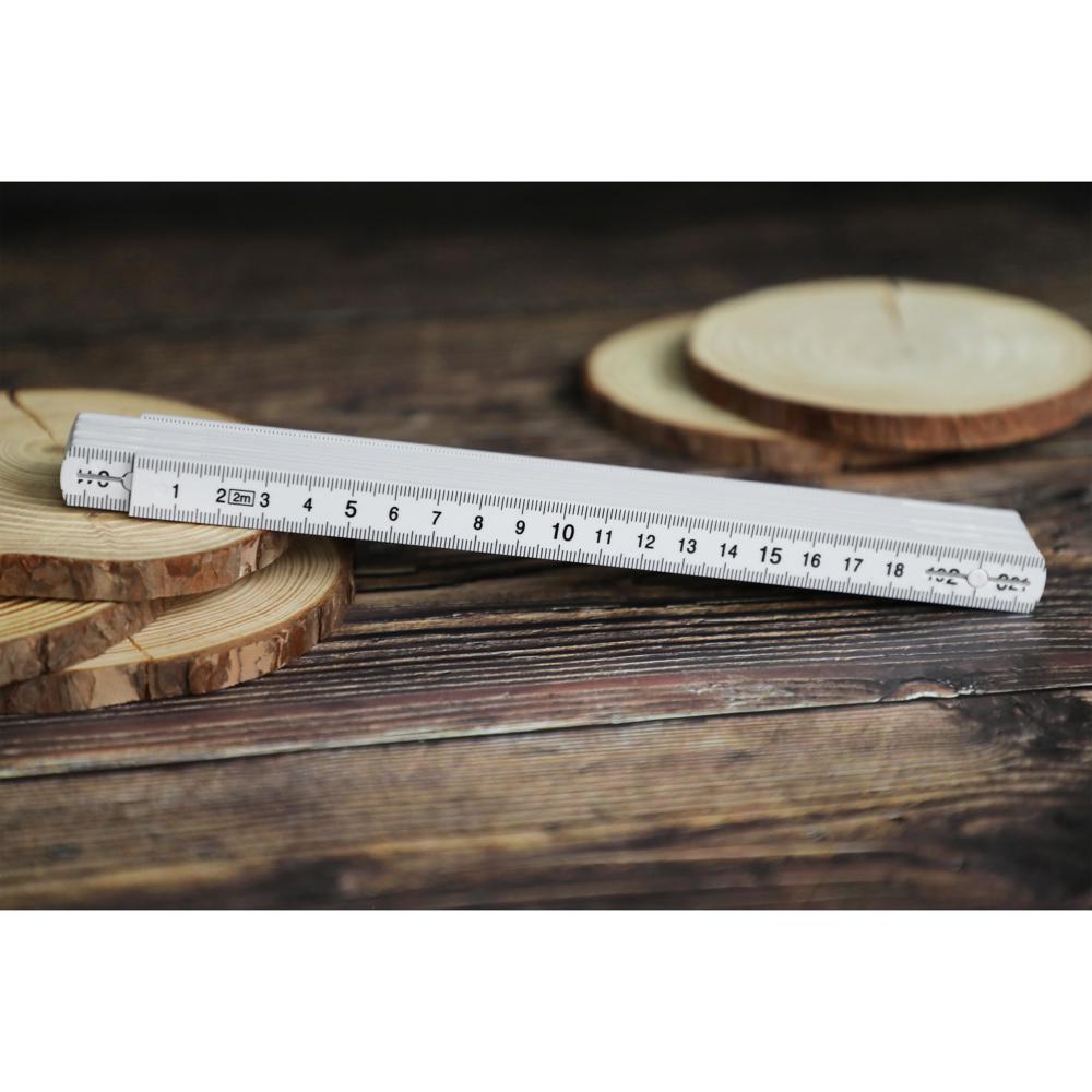Handelsüblicher Zollstock aus ABS mit 2 Metern Länge bei 10 Segmenten. Der Zollstock hat eine 90° Einrastung.