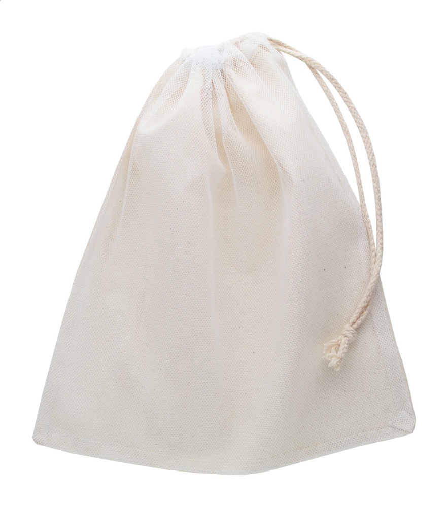 Wiederverwendbarer Obst-/Gemüsebeutel aus Baumwolle (95g/m²) mit Polyesternetz auf der Vorderseite und Zugkordelverschluss.