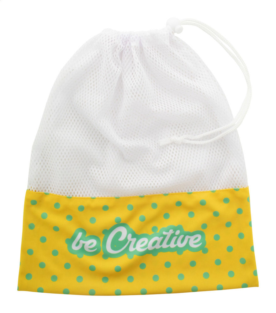 Individueller Polyesterbeutel mit Netz-Oberteil und Kordelverschluss. Der Preis ist inkl. vollflächigem Sublimationsdruck (ausgenommen Netz). Mindestmenge: 50 Stk.