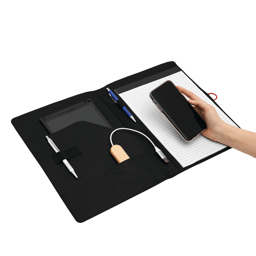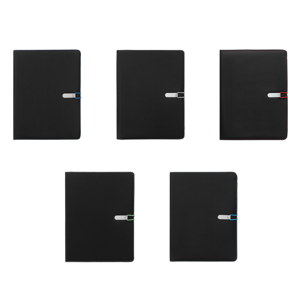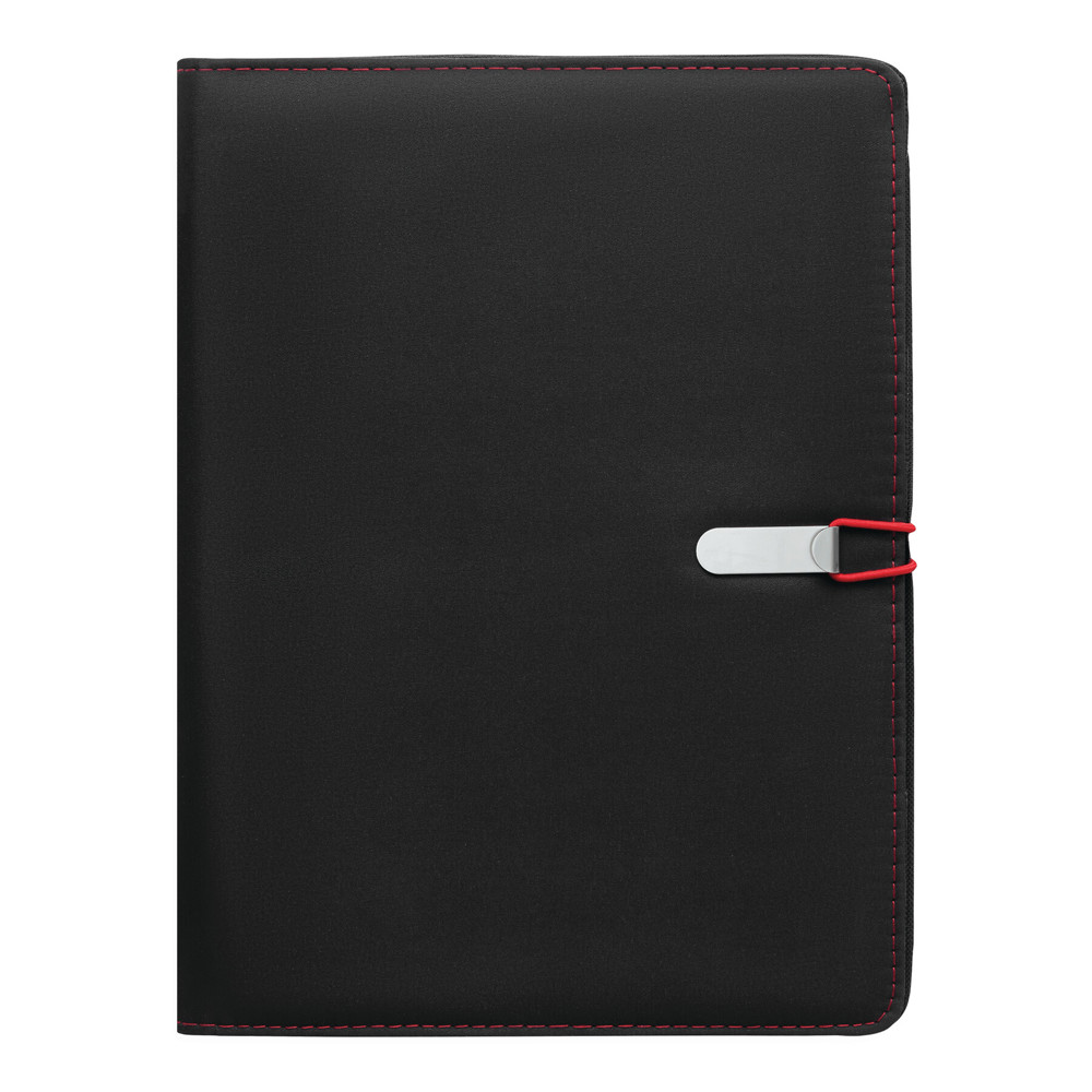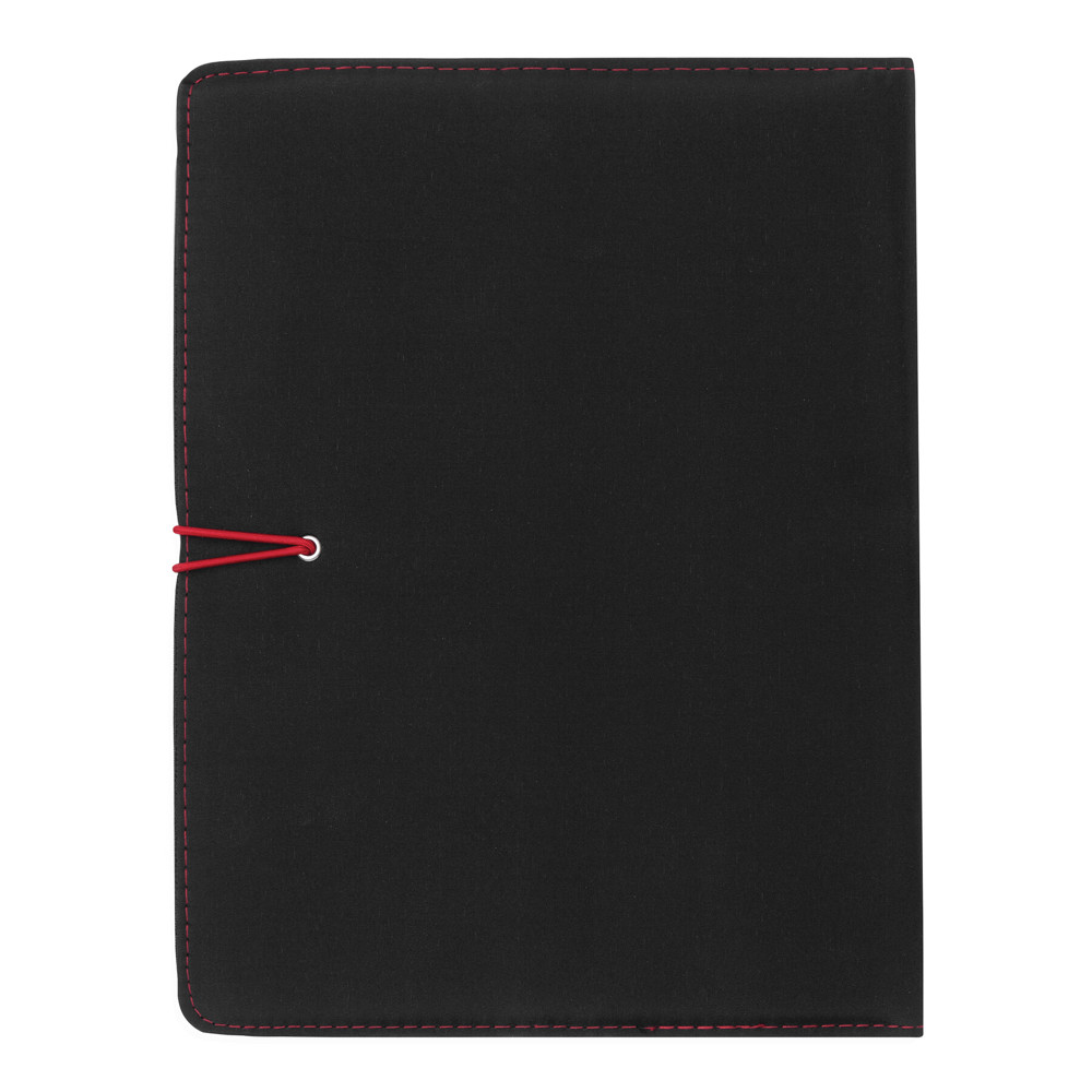 Konferenzmappe SESSION im DIN-A4-Format: Metallhaken mit farbigem Gummiband zum Verschließen, innen diverse Einsteckfächer, 2 elastische Schlaufen, inkl. Schreibblock (liniert), Schlaufe für 1 Schreibgerät, außen mit farbigen Ziernähten