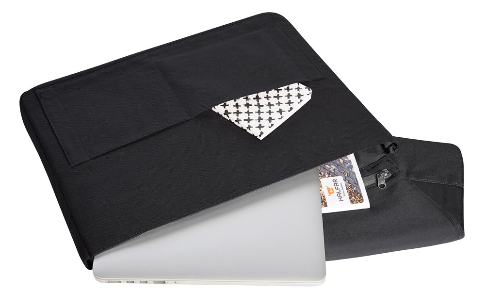 moderne, aufwändig verarbeitete Notebook-Hülle; liebevoll gestaltet mit beschichtetem Baumwoll-Besatz; geeignet für Notebook und DIN A4-Unterlagen; zwei flache Einsteckfächer auf der Front; Reißverschluss-Fach im Überschlag innen; großes Reißverschluss-Fach rückseitig; Magnet-Verschluss