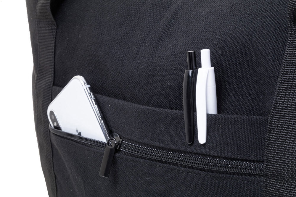Reise-/Sporttasche aus recycelten Canvas mit Hauptfach mit Reißverschluss, Vordertasche, verstellbarem Schultergurt und Reißverschlusstasche auf der Rückseite, die auch als Trolleygurt dient. 70 % recycelter Baumwolle und 30 % RPET-Polyester. Mit Label recycelte Baumwolle.