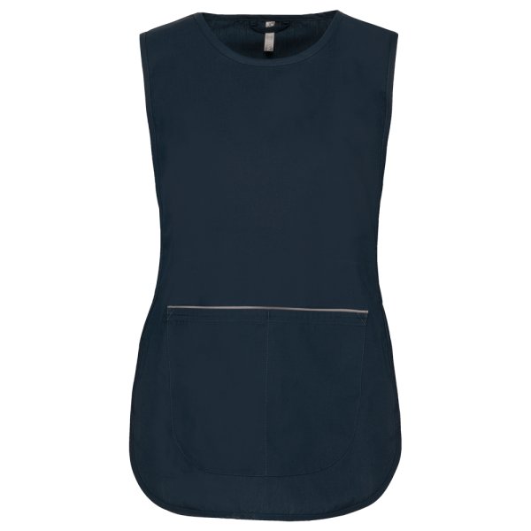65 % Polyester / 35 % Baumwolle. Bei 60 °C waschbar. Strapazierfähiger Stoff und Reguläre Passform. Große Fronttasche mit 2 Fächern und 1 kleine Innentasche. Über 2 Druckknöpfe verstellbare seitliche Schlaufen. Kontrastfarbene Paspel oben auf der Tasche. 1 Namensetikett auf der Innenseite. Abgerundeter Saum. Taillenlänge L/XL: 78 cm.